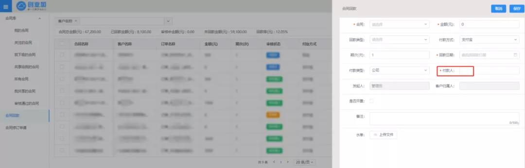 为保障财务审核流程的快速推进,审核效率的持续提升,本次更新已在【合同回款】与【待审核发票】处分别新增【付款人】字段与 【批量审核】操作按钮。值得注意的是,【付款人】为必填项,保存时不可空缺。