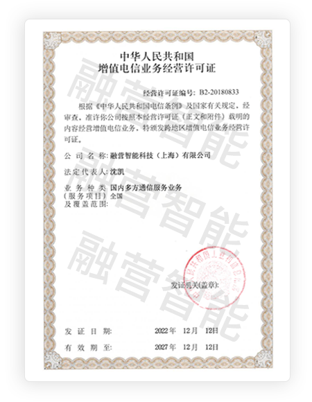 融营智能科技(上海)有限公司(以下简称:公司),是国内领先的企业智能云通信服务机构,拥有全国范围内授权许可的增值电信业务和多方通信业务的资质能力,