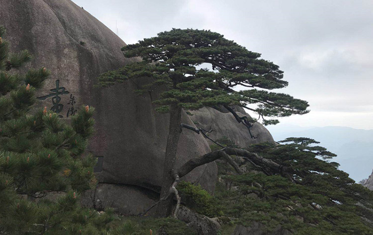 缆车匀速运行,只是看到脚下陡峭的悬崖峭壁,好似龙飞凤舞,使人眼花潦乱,真有腾云架雾、一步登天的感觉。那满山遍野的黄山松,有倒悬,有直立,莽莽苍苍,青翠欲滴。下缆车就感到阵阵凉意,山间薄雾蒙蒙,在不远处的巨石上就是黄山的标志的三颗松树。最先看到的是送客松,送客松的松针呈墨绿色,在一簇簇绿叶间的缝隙中,褐色的枝干弯弯曲曲,富有生命力。接着是让人感到亲切的陪客松,两株松树直入云天,高大挺拔。最后看到的便是迎客松了,迎着阳光雨露,朝气地生长着,不畏严寒,不畏酷暑,以不屈的身姿屹立在群山之中。