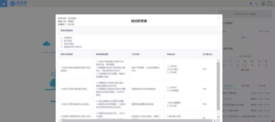 考虑到企业需要源源不断地吸收新鲜血液,引进和孕育新生人才,新版本的创业加BPM新增【岗位职责表】,以此帮助企业员工使用者更快了解职责详情, 【岗位职责表】的位置处于右上角头像处,点击岗位名称即可查看。